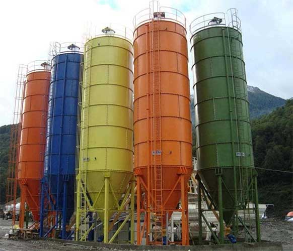 Silo de construcción vertical para almacenamiento de cemento, fabricado en chapa de acero de 1/8 o 3/16 según volumen de almacenamiento, base cónica para facilitar la descarga y patas auto portantes.